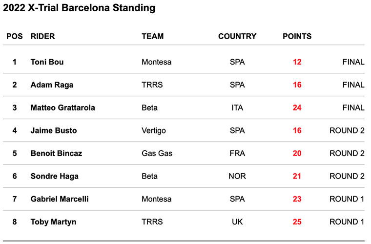 Toni Bou (Repsol Honda Trial Team) claimed his fourth victory of the 2022 X-Trial World Championship. Returning to the venue where he secured his fifteenth world title back in November, Bou picked up the maximum available 22 Championship points to extend his lead over main rival Adam Raga (TRRS) to a mammoth 30 overall. Raga again pushed Bou hard throughout the night, finishing tied with the reigning title-holder in Round One, before losing out by three marks in the second Round and four marks in the Final. Section Four proved the difference between the two, Raga suffering a fiasco while Bou took just a single mark to pull clear.