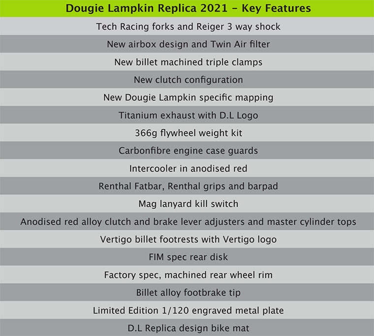 This has enabled us to build the most responsive, agile, smooth and refined DL Replica to date. The bike is a true replica in every sense as all of Dougie’s own, personal preferences in suspension geometry, power delivery and map settings have been incorporated into this latest model. As well as all of these personal settings the bike is loaded with a wealth of high-end racing components.