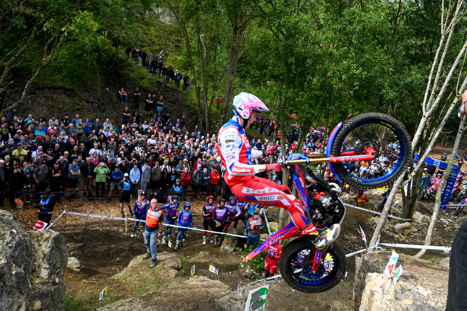This was the first time that FIM Trial World Championship has visited Great Britain after a seven year absence with an event that was welcome in the international calendar and took place at the Boughton House Estate in Northamptonshire over the weekend of the 6th and 7th of September. The world’s best riders from all five classes; TrialGP, TrialGP Women, Trial2, Trial2 Women and Trial3 assembled in front of a huge crowd of fans to compete over two laps of 12 observed sections on each day. Two of the sections would be man-made in the start and finish area and the others would consist of rocks and steep climbs in the heavily wooded area giving spectators a close up view of the action. Superb weather over the weekend of the event was only interrupted by a brief shower on Sunday which was enjoyed by an estimated crowd of 14,000 people over the two days.