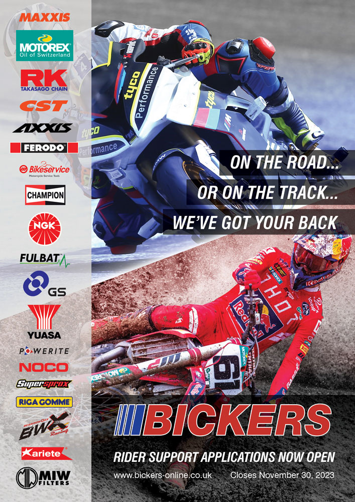 Bickers hugely popular rider support has returned for another year and support is open for ATV/UTV, BSB, Road Racing, MX, Enduro, Trials riders and teams – support can range from discounted products to full sponsorship.