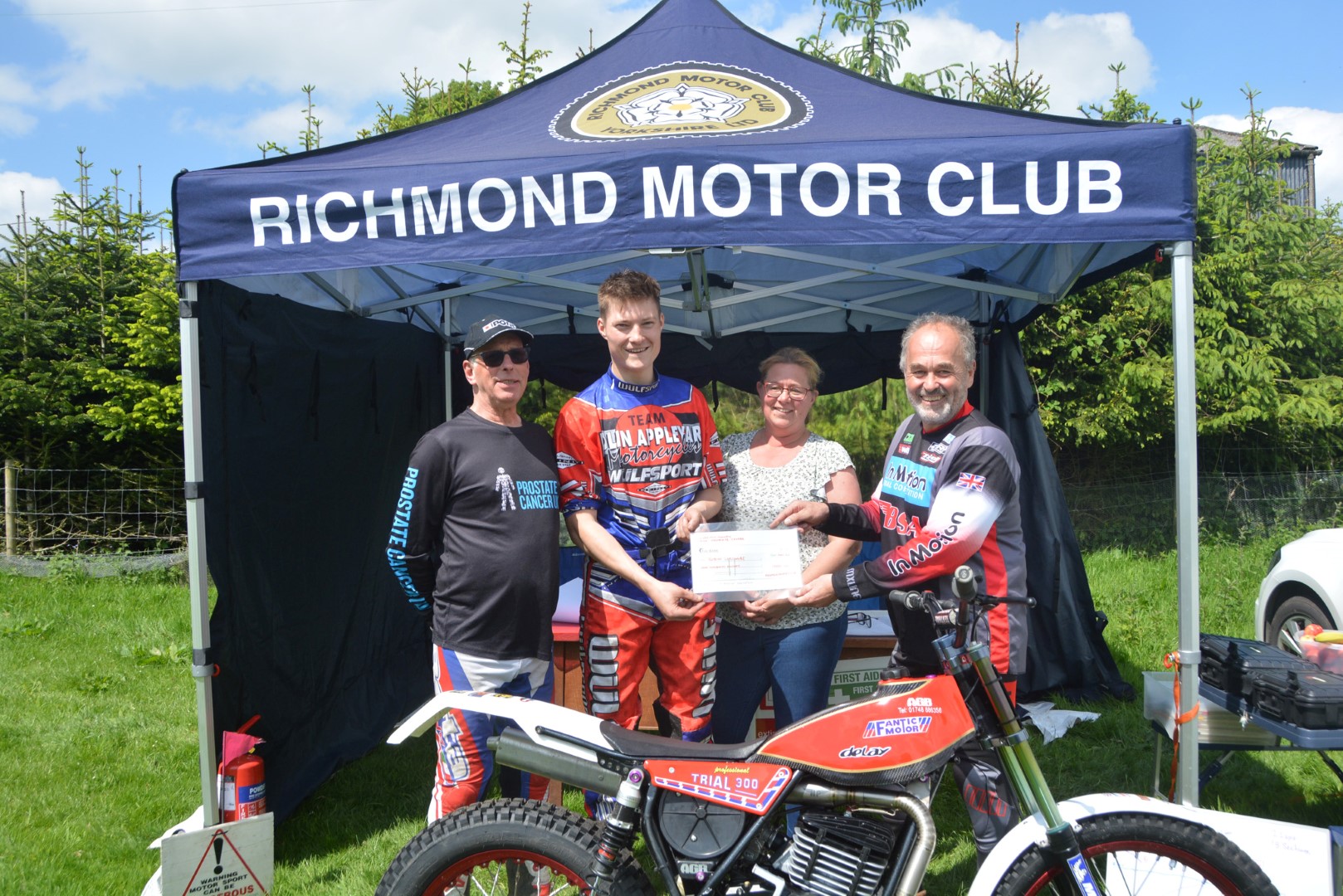 Before the riders kicked off for the weekend, Club Secretary Sandra Fowler and Blue Bar Trial Clerk of Course Sam Lambert presented a cheque to rider Robin Luscombe on behalf of Richmond Motor Club as a donation for his Prostate Cancer Charity Marathon, which will be held on Saturday 10th August 2024 in order to raise both awareness of prostate cancer and money for Prostate Cancer UK. Robin was diagnosed with prostate cancer in late 2023, but was able to get an early diagnosis and is now back on his bike again! He is raising awareness of the importance of catching it early in order to save lives, as many trials riders are males over 45 and should be getting themselves checked early.
