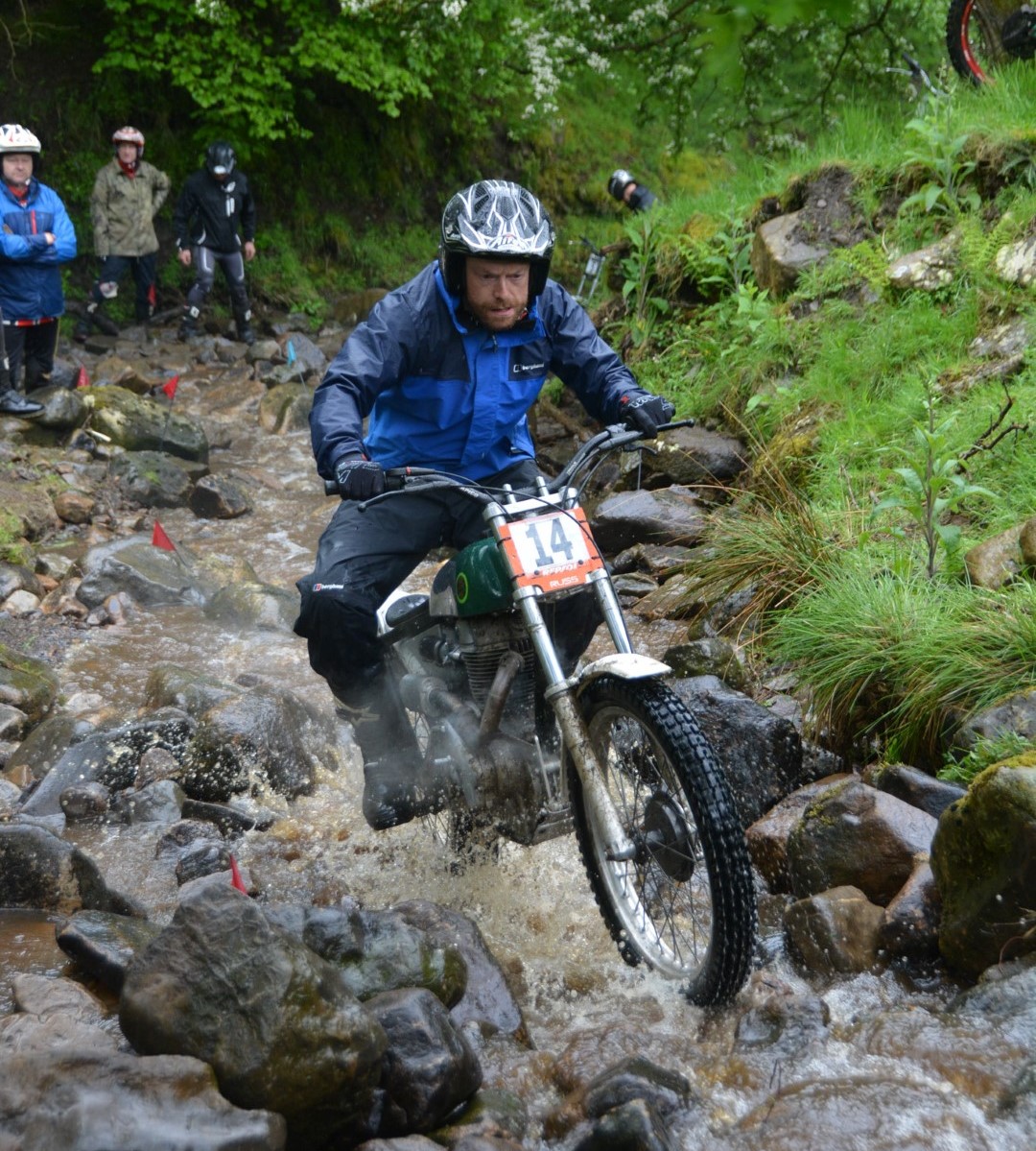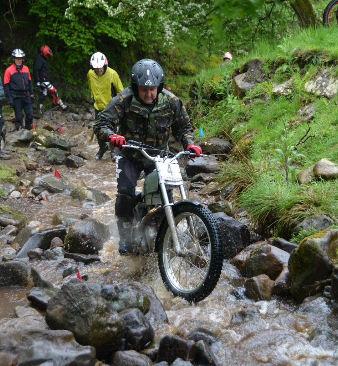 The riders followed the course up the dale to Braidley, where a loop of 16 sections awaited. Sections 3 and 4, observed by AG Brown and Steve Lambert, were most difficult for the riders due to the torrenting water lashing down the becks, making it difficult to see obstacles submerged under the white water.