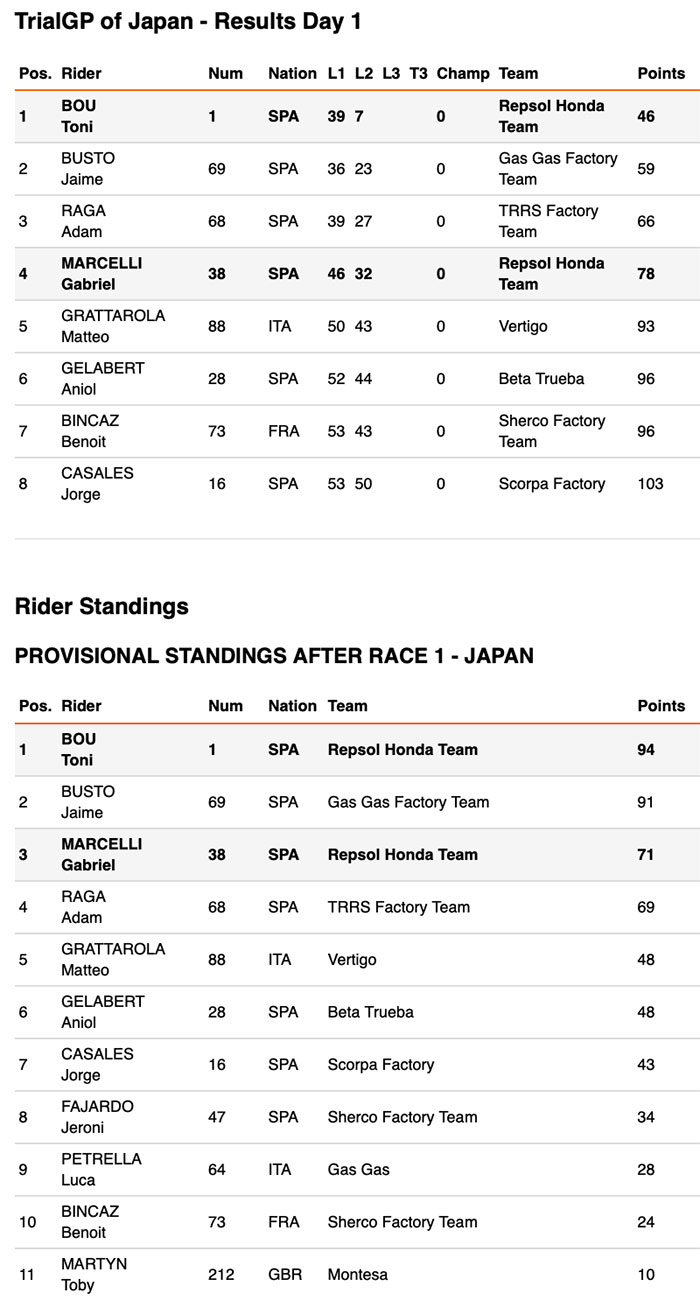 After the results of the first round of the Japanese TrialGP, the Repsol Honda Trial Team riders remain at the top of the overall standings. Bou is outright leader and Marcelli retains third place.