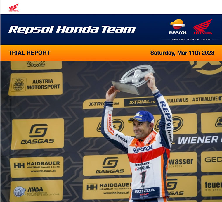 The Repsol Honda Trial Team rider maintains the lead of the X-Trial series after taking second place in Wiener Neustadt, Austria. Teammate, Gabriel Marcelli, finishes fourth