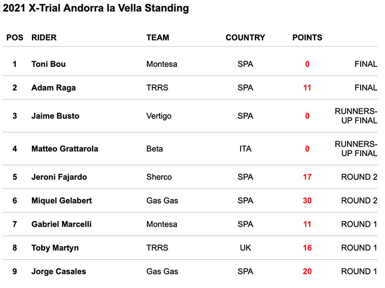 For the eighth consecutive X-Trial it was Adam Raga who finished second to Bou in the Final as he secured his 37th consecutive podium. On the night he passed Dougie Lampkin in the all-time appearance records with his 136th start, Raga matched Bou in Round One but could only finish second to him in the two subsequent laps. A disastrous failure in Section One of the Final set the tone for the decider, and six dropped marks in the last two sections left him on a score of eleven.