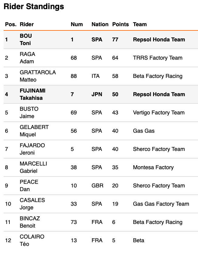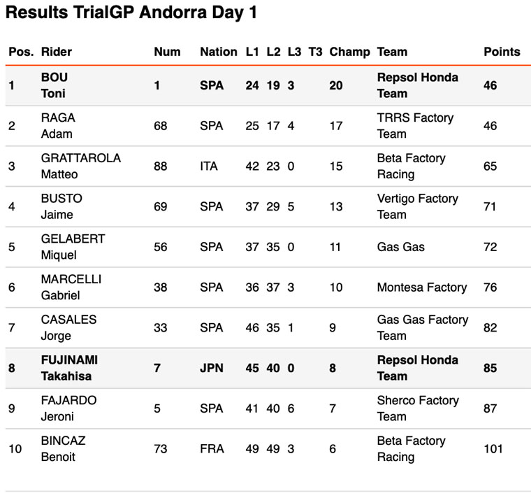 Repsol Honda Team rider Toni Bou fought neck and neck against long-term arch-rival Adam Raga for the triumph throughout the two laps of the Andorran course. Bou and Raga constantly traded places at the head of the table, but in the end it was Toni Bou who claimed the win, in spite of finishing on 46 marks, the same number as his rival. The tie-breaking factor proved to be the total time taken in completing the route, with the Repsol Honda Team rider finishing one minute ahead. Another fine result sees Toni Bou continue to top the championship leaderboard, now holding a thirteen-point advantage in the general standings.
