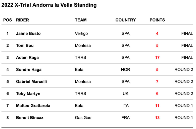 Raga dropped out the fight to win with two points in the third section and another five in the fourth, whilst Bou got through the remaining four sections without picking up a single point and Busto adding just 2 more points in the fourth. The three point advantage gained in the second zone were key to the Basque rider’s one point margin to seal a great performance and win the Andorra la Vella X-Trial.