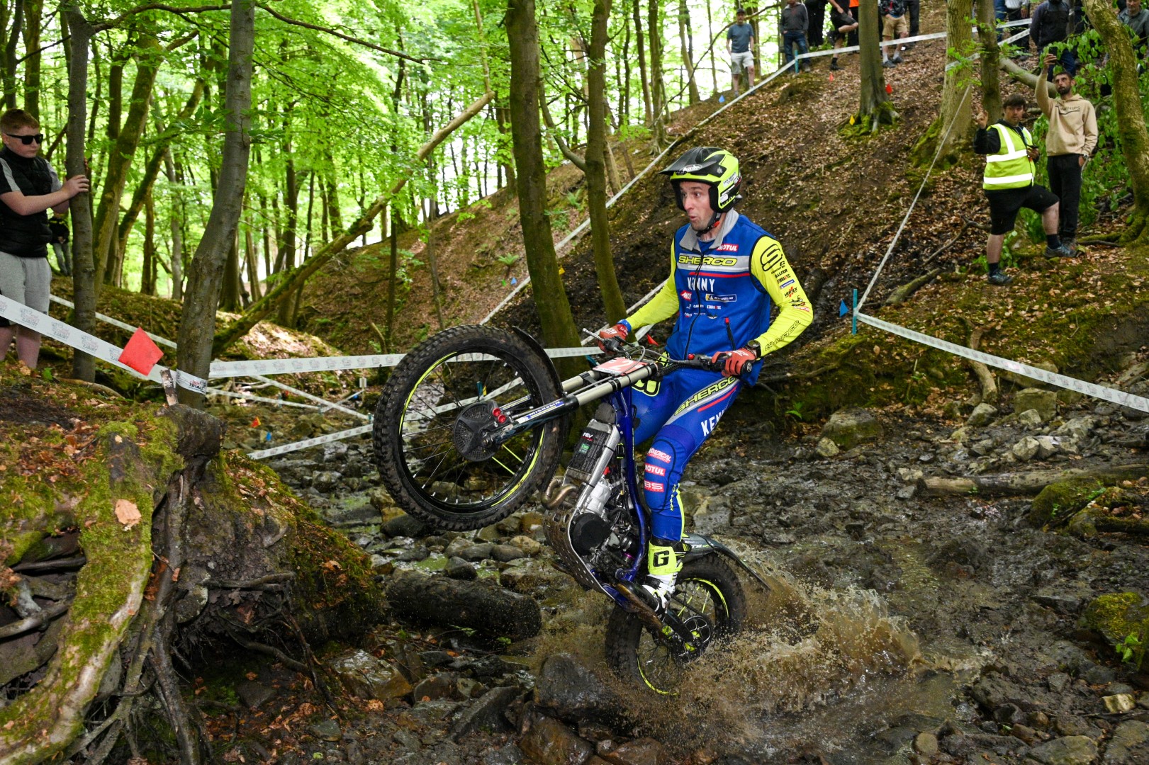 With the current ACU Trial GB British Champion Toby Martyn (Montesa-Honda UK) a non-starter as he recovers from injury it was Billy Green (Scorpa) who held a slender single mark advantage after the opening lap as Jack Peace became engaged in a battle with the young Harry Hemingway as they were locked together on 22 marks lost each. Despite still carrying the effects of a dislocated shoulder from the previous weeks world championship in Japan, Hemingway was riding very well in the fight for the win.