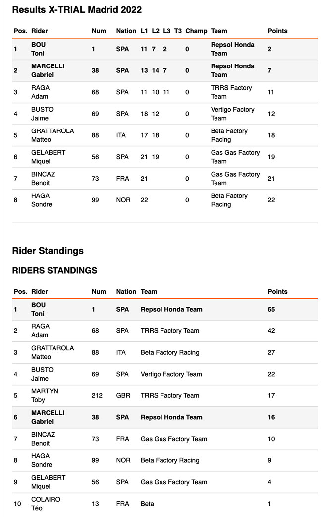 A third consecutive win in the X-Trial World Championship for Toni Bou, who consolidates his position as overall leader. Gabriel Marcelli, with a brilliant performance at the Madrid Arena, finished runner-up in his tenth participation in an X-Trial World Championship event.