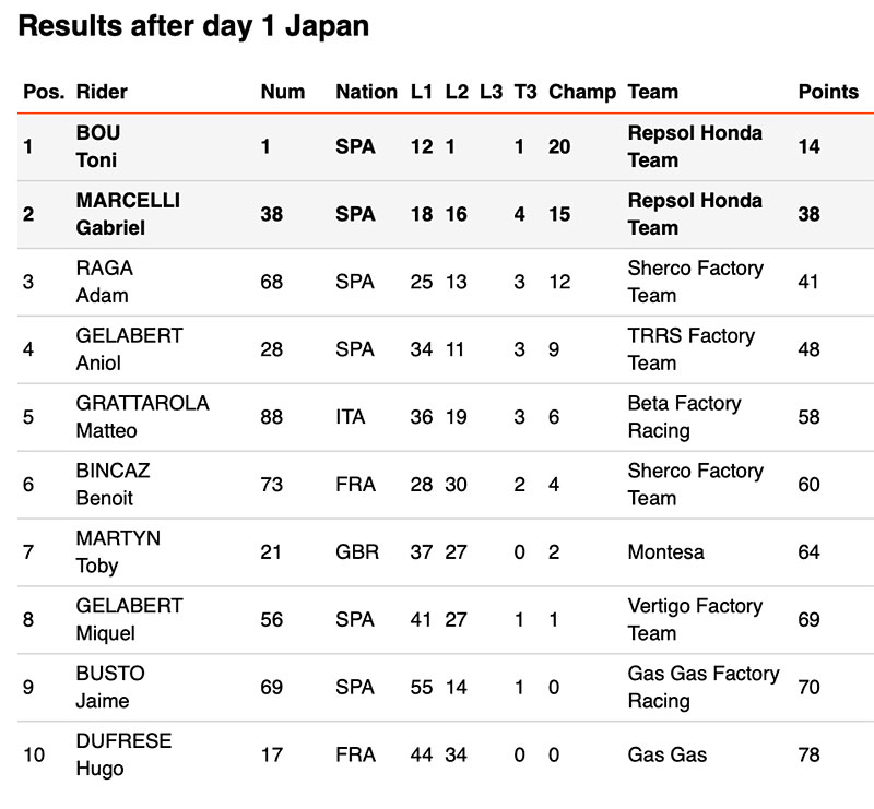 From the first lap, Bou was the frontrunner, making few mistakes and picking up just 13 penalty points on the 12 zones. On the second lap, the Repsol Honda rider showed his dominance by incurring just a single penalty point, earning him the first victory of the 2024 season. In his career, Bou has 20 wins at Motegi.