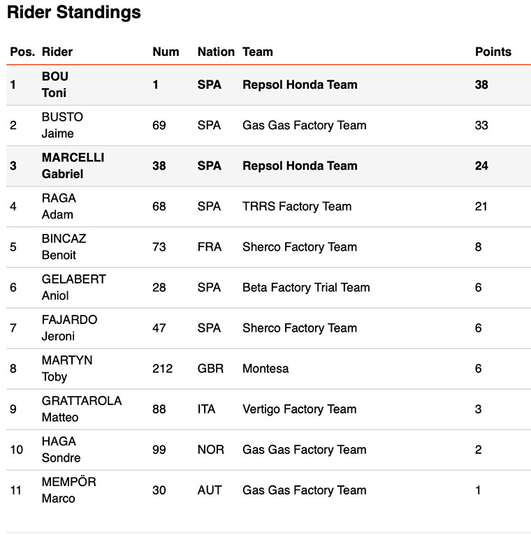Teammate Marcelli remains in the Top 3 overall, thanks to his second position in Barcelona and fourth place in Austria. The Repsol Honda Trial Team rider’s goal on Saturday is to continue in the fight for the title and get back onto the podium.