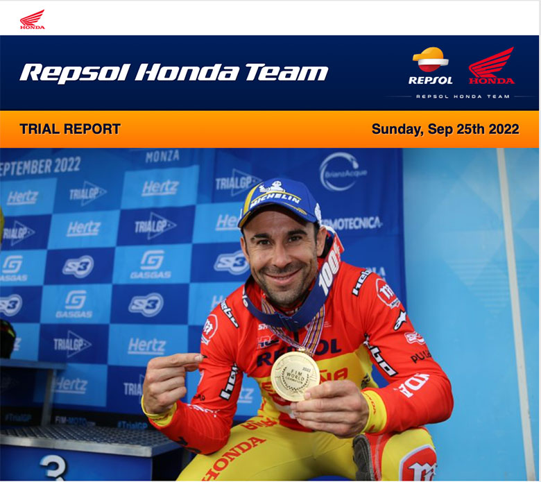 The Repsol Honda Trial Team rider has lifted aloft yet another world championship trophy today, this time as part of the Spanish Trial des Nations squad competing at Monza. It marks a seventeenth title for Bou with the national team.