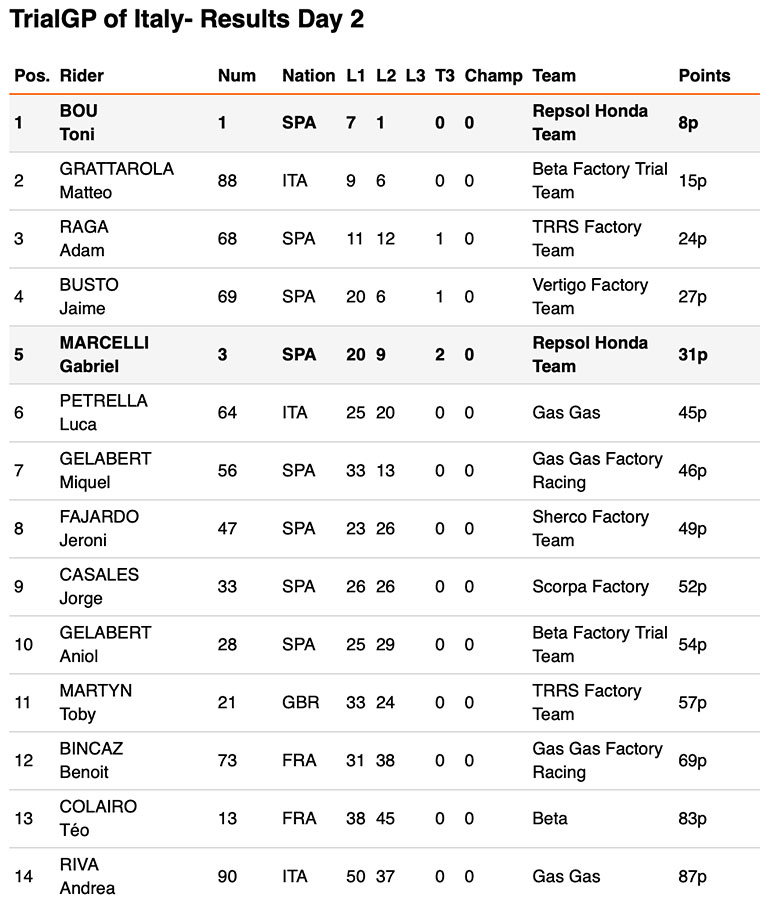 Meanwhile, Gabriel Marcelli left it until the final trial of the 2022 TrialGP season to manage to sneak into the top five. The Repsol Honda Trial Team rider made some mistakes on the first lap that hampered his chances of a podium, yet, despite a fine second lap, Marcelli had to settle for fifth place. With today’s result in Italy, the Galician rider has achieved his best ever finish in the TrialGP World Championship with a noteworthy fifth position, with a total tally of 109 points in his first season with the Repsol Honda Trial Team.