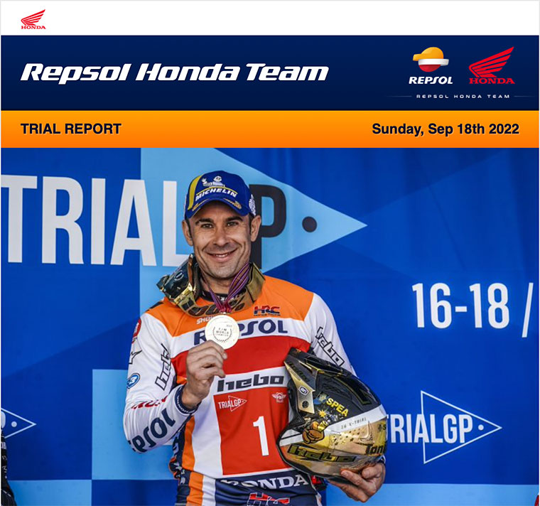 The last trial in Italy, brings the 2022 TrialGP World Championship to an end for the Repsol Honda Trial Team. The next date on the calendar for Toni Bou will be this forthcoming Sunday, 25 September in Monza, where the Montesa rider will take part in the Trial de Nations representing the Spanish national team.