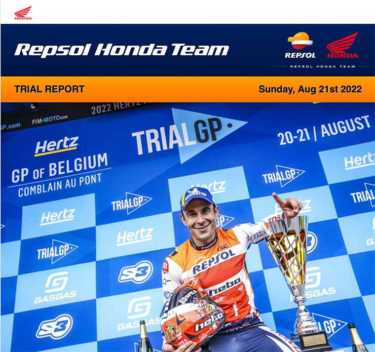 With the summer break over, the Repsol Honda Trial Team riders were back in the thick of the action today for the TrialGP of Belgium. The single-day event was characterised by a demanding and somewhat technical course, full of slippery sections with very little grip that proved a tough test for all the riders involved.