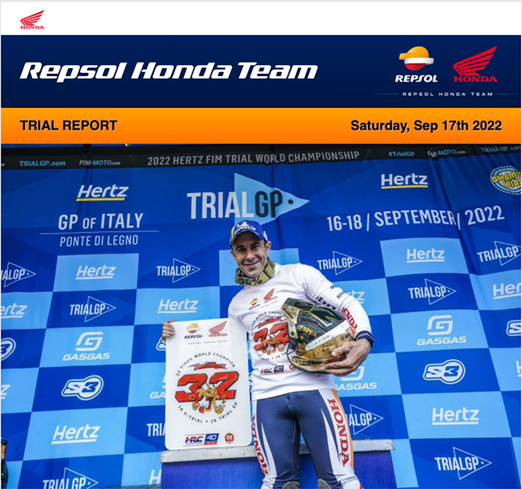 The 2022 TrialGP World Championship crown has a new owner – none other than Toni Bou. The Repsol Honda Trial Team rider, second in today’s trial in Ponte di Legno, now possesses 32 world trial titles, with a tally of 16 consecutive titles in TrialGP and another 16 in X-Trial.