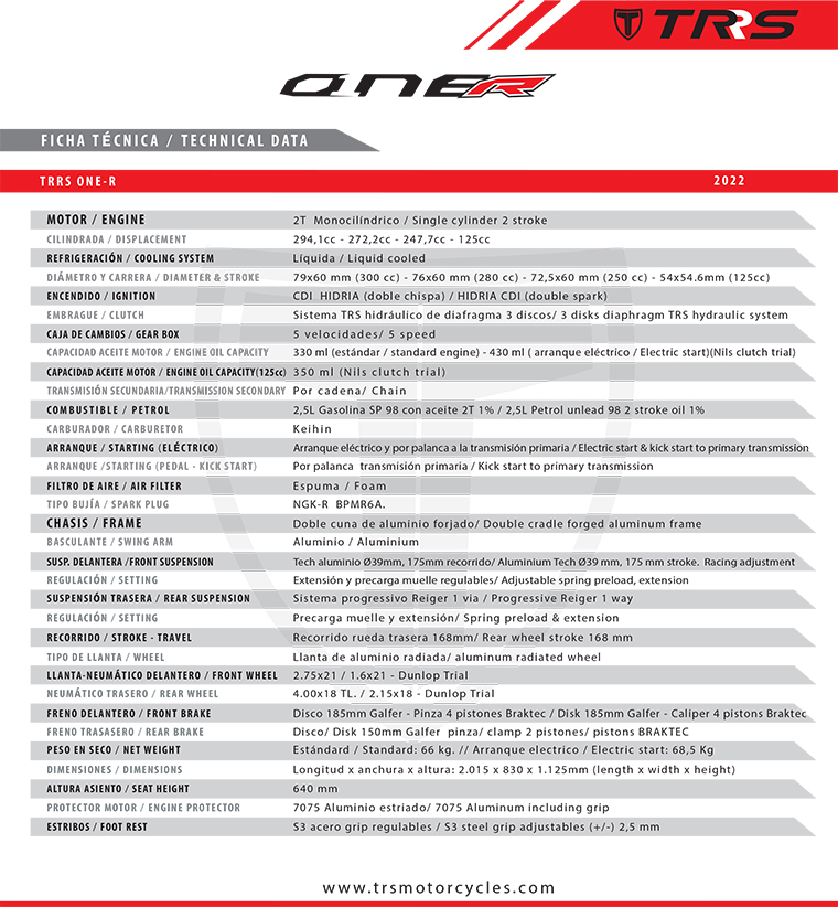The New TRRS ONE R, is presented with the latest technical innovations of the brand; Engine with aluminum injection crankcase, Clutch cover with oil level sight glass, Reiger one-way rear shock absorber, Keihin PWK 28 carburetor and TECH aluminum front suspension, providing an even better driving experience.