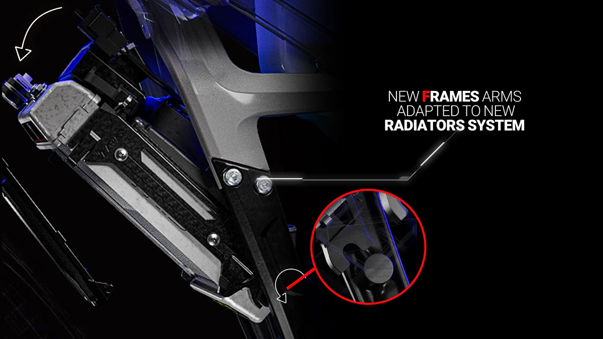 Redesign of the radiator assembly including: new radiator, redesigned guard, fan support, new generation fan, CDI support rubber and new silent block system for better support of the assembly and vibration isolation.