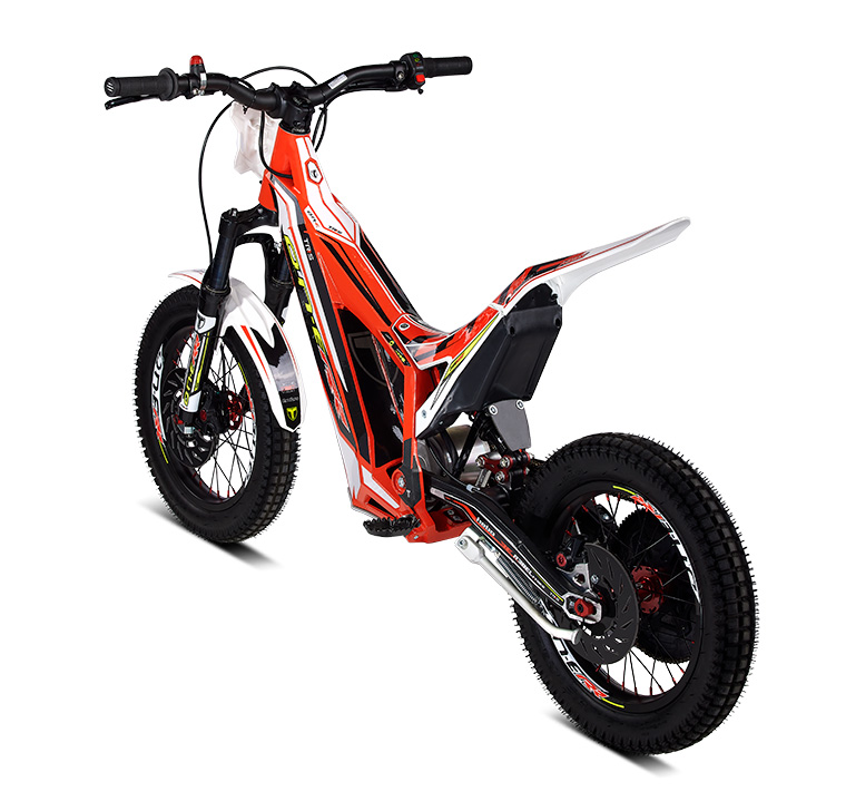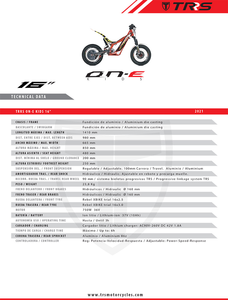 A motorcycle that provides same driving dynamics to those of its older sisters ON-E Kids 20”, thanks to its monocoque frame, the cast aluminum swingarm, a rear shock with progressive system, ergonomics and components in general terms; a motorcycle that incorporates a controller that allows a precise adjustment of its performance to the real level of each pilot, power, speed and response.